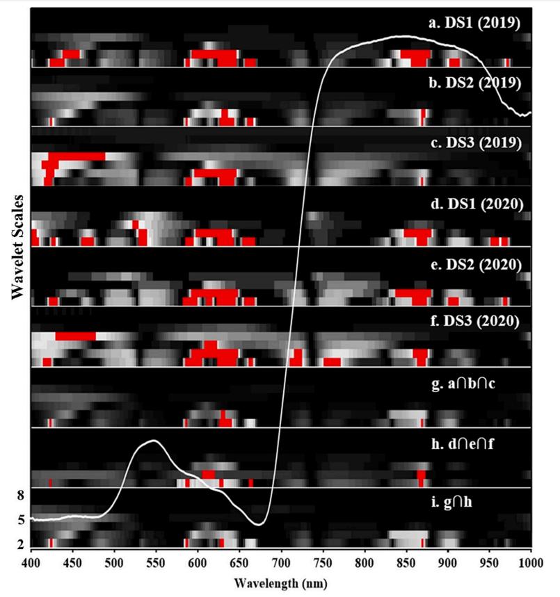 图3. 2019年(a-c)和2020年(d-f)小麦赤霉病的小波系数相关标度图