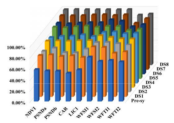 图4. 基于植被指数和机器学习分类器的小麦赤霉病平均分类精度对比图