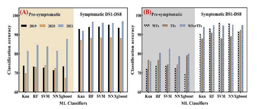 研究结果表明,赤霉病最显著的小波特征在可见光区域的波段为420-440nm和580-680nm、近红外区域为850-880nm、920-940nm和980nm(图3)。然而针对不同的病害阶段,敏感小波特征有所差异,最终确定了赤霉病监测小波特征为2尺度下的423、581、624、865小波系数。同时,基于灰度共生矩阵计算出这些小波特征的纹理特征,再经过任意两两组合,筛选出了四个赤霉病监测新型指数(WFSI1、WFSI2、WFTI1、WFTI2)。经过与传统植被指数对比发现,新型赤霉病监测指数具有更好监测能力,病害阶段1和2的三年平均分类精度(ACA)分别是80%、90%和91%(图4)。然而,将光谱指数和纹理指数一起作为输入,小麦赤霉病的分类精度得到了进一步提升,三年ACA分别提高到98.06%、89.67%和94.83%。对比不同的机器学习算法发现,Xgboost展现出更好的稳定性和准确性(图5)。这项工作揭示了高光谱成像技术在小麦赤霉病早期监测上的巨大潜力,也为作物病害监测提供了较好的参考。
