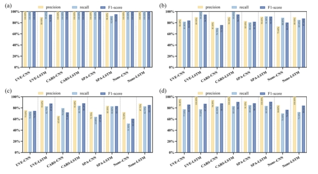 最后,利用CNN、LSTM和SVM算法建立了茶叶轮斑病的早期检测模型和抗病品种的快速筛选模型。在实验室的理想条件下,CARS-LSTM模型展现出了高达92.6%的检测准确率(图3)。在田间茶园的应用中,693 nm+727 nm结合CNN模型也达到了87.8%的优异表现,展现了强大的实用潜力。