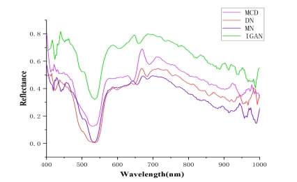 图3展示了不同疾病类型的平均光谱曲线的趋势,由于其来自相同的肾组织,曲线趋势一致,但在特定波段的反射率值存在细微差异,表明不同疾病的内部组成差异。