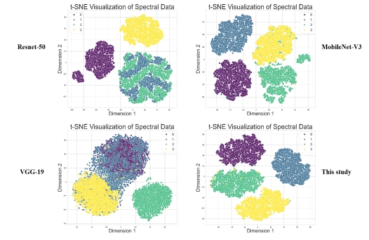 t-SNE算法将复杂的高维网络特征映射到一个二维景观中,其中不同颜色的点代表不同肾小球疾病的t-SNE特征识别。图8清楚地显示,与其他三种替代模型不同,本研究采用的模型表现出相同疾病表现对应的数据集的紧密聚类,通过清晰的边界和空间分离,突出了不同疾病状态之间的差异。一些偏离其指定集群的样本无意中与不同疾病类别的集群相一致。这一观察结果在一定程度上证明了不同模型在肾小球疾病分层的二维框架内处理图像数据的能力。此外,这些发现显著地强调了本研究中提出的模型在区分不同肾小球疾病实体方面的敏锐性。