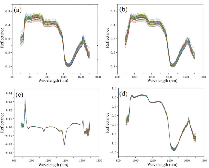 图3 预处理方法比较((a)原始光谱;(b)SG平滑滤波器;(c)一阶导数;(d)SNV)