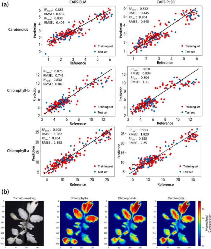 图5 预测结果((a)PLSR和ELM的比较;(b)色素浓度的可视化)