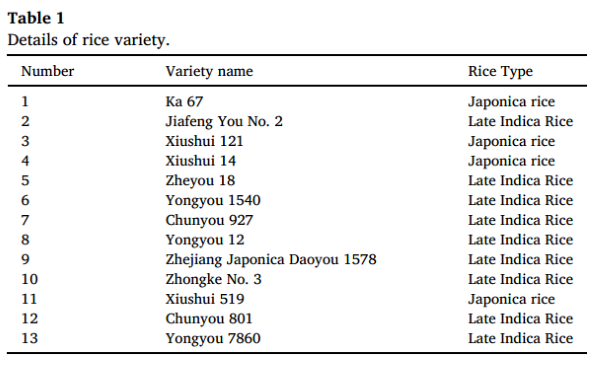 本研究以2021年收获的13个晚稻品种为实验材料,其中包括4个粳稻品种和9个晚籼稻品种,具体信息如表1所示。所有晚稻样品均由浙江省粮库提供。每个品种的晚稻样品均采用自封袋密封包装,并储存于恒温恒湿环境中(温度10℃,湿度50%)。