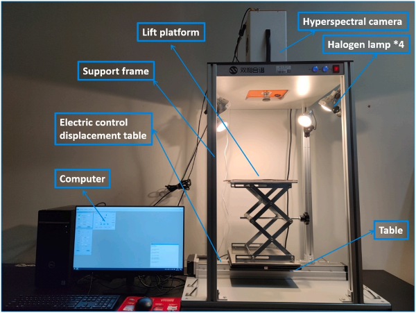 高光谱成像系统由近红外高光谱成像仪(GaiaField-N17E,江苏通宝TB888科技有限公司,Dualix Spectral Imaging)、室内试验箱(HSIA-BD)、四盏卤素灯(50W)、升降台、计算机以及配套软件(Optiplex 7080MT/SpecView)组成。该近红外高光谱成像仪的光谱范围为900至1700nm,空间分辨率为640像素,波段数为512,光谱分辨率为5nm。升降台的尺寸和升降范围分别为300×300毫米和90至370毫米。系统如图1所示。