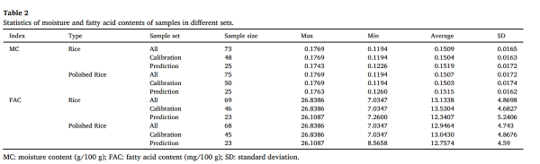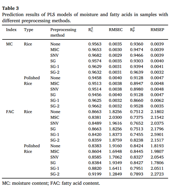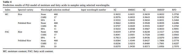 五种预处理方法被用于处理大米和精米样品的光谱,并且使用偏最小二乘回归(PLSR)算法建立了MC和FAC的校准模型。表3显示了不同预处理方法下MC和FAC样品PLS模型的预测结果。从表3中可以发现,在“大米水分”模型中,使用SNV和SG-2预处理得到的结果是较好的。使用SNV预处理建立的模型的决定系数(R²C)相对较高,达到了0.9682。然而,该模型不稳定,稳健性较差,预测相关系数(R²P)仅为0.9466。因此,SG-2预处理的模型比SNV预处理的模型表现更好。在“大米脂肪酸”模型中,除了SG-2外,其他预处理方法的R²P未达到0.8,且R²P与R²C差异显著,因此这些模型的稳健性较差。因此,SG-2是“大米脂肪酸”模型中*佳的预处理方法。对于“精米水分”,SG-2预处理的模型具有更高的R²C和R²P。总之,SG-2是在“大米水分”、“精米水分”和“大米脂肪酸”三个预测模型中*佳的预处理方法。这三个模型的R²P和均方根误差(RMSEP)分别为0.9639、0.9528、0.8238和0.0032、0.0035、2.1517。而在“精米脂肪酸”模型中,SG平滑是*佳的预处理方法,该模型的R²P和RMSEP分别为0.8427和1.7806。