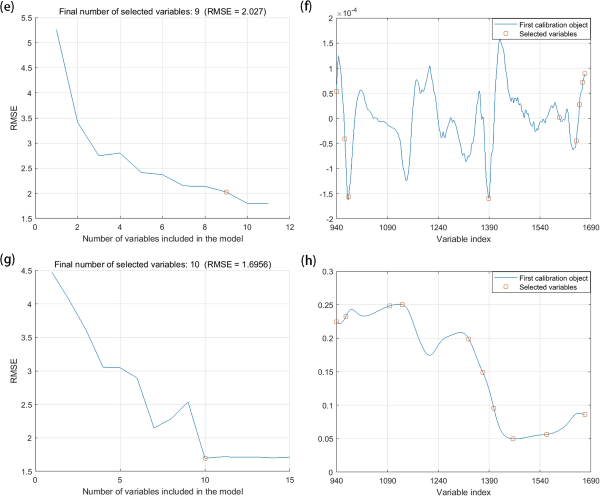 图3. SPA对大米/精米中水分和脂肪酸的波长选择结果。(a) 大米中水分的RMSE变化 (b) 大米中选定水分波长的分布 (c) 精米中水分的RMSE变化 (d) 精米中选定水分波长的分布 (e) 大米中脂肪酸的RMSE变化 (f) 大米中选定脂肪酸波长的分布 (g) 精米中脂肪酸的RMSE变化 (h) 精米中选定脂肪酸波长的分布。