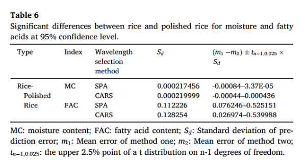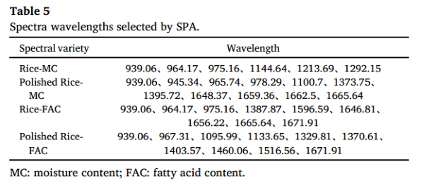由于稻壳的高吸水能力,大米中MC模型的性能优于精米,且大米光谱中包含了更多的水分信息。而大米中FAC模型的性能不如精米。因为稻壳不含有脂肪酸,而存在于大米光谱中的稻壳干扰信息可能会影响脂肪酸的预测。然而,在进行波长选择后,大米和精米中MC或FAC的预测精度更为接近,看起来稻壳的影响消失了。因此,通过Fearn提出的方法验证了稻壳对MC和FAC预测精度的影响。*一种方法是计算在95%置信水平下区间是否包含0。如果包含零,则偏差在5%水平上没有显著差异。从表6可以看出,计算出的大米和精米MC预测误差的区间包含0,而FAC的区间不包含0。这表明大米和精米FAC预测误差之间存在显著差异,因此稻壳对FAC的预测精度有影响。