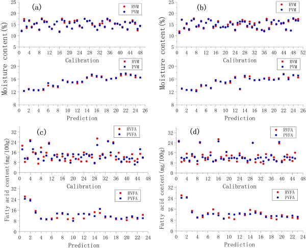 图4. 大米/精米中水分和脂肪酸预测结果的散点图:(a) 大米中的水分;(b) 精米中的水分;(c) 大米中的脂肪酸;(d) 精米中的脂肪酸。RVM:水分的实际值;PVM:水分的预测值;RVFA:脂肪酸的实际值;PVFA:脂肪酸的预测值。