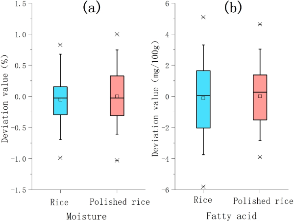 图5. 大米和精米水分和脂肪酸预测偏差值的箱线图:(a) 水分;(b) 脂肪酸。