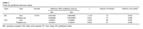 通过对大米和精米中的水分和脂肪酸的预测值与真实值进行T检验分析。如表7所示,得到的T检验值P大于0.05。这表明所建立模型的预测值与真实值之间没有显著差异。因此,这些模型在预测水分和脂肪酸方面表现良好。