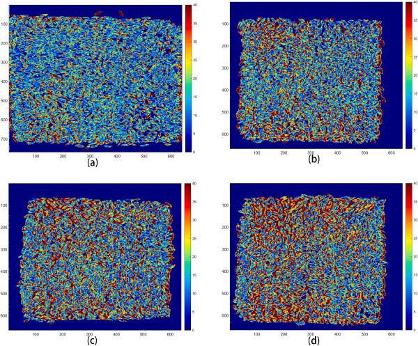 图7. 大米脂肪酸含量的可视化图。(a) 脂肪酸含量 = 8.42毫克/100克 (b) 脂肪酸含量 = 16.13毫克/100克 (c) 脂肪酸含量 = 23.91毫克/100克 (d) 脂肪酸含量 = 25.56毫克/100克。