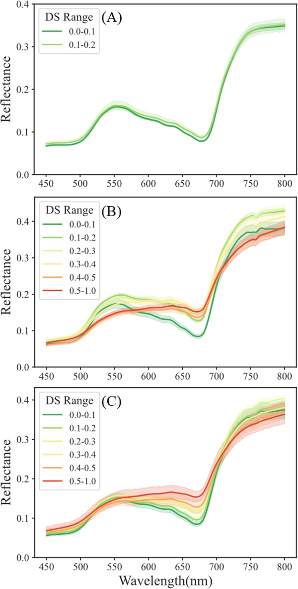 图5.不同生长阶段(A 抽穗,B 开花,C 灌浆)水稻稻穗在不同程度RSRD(RSRD)严重度下的反射光谱。(A)中的DS范围较窄,这是由于早期感染阶段允许的检查水平较低
