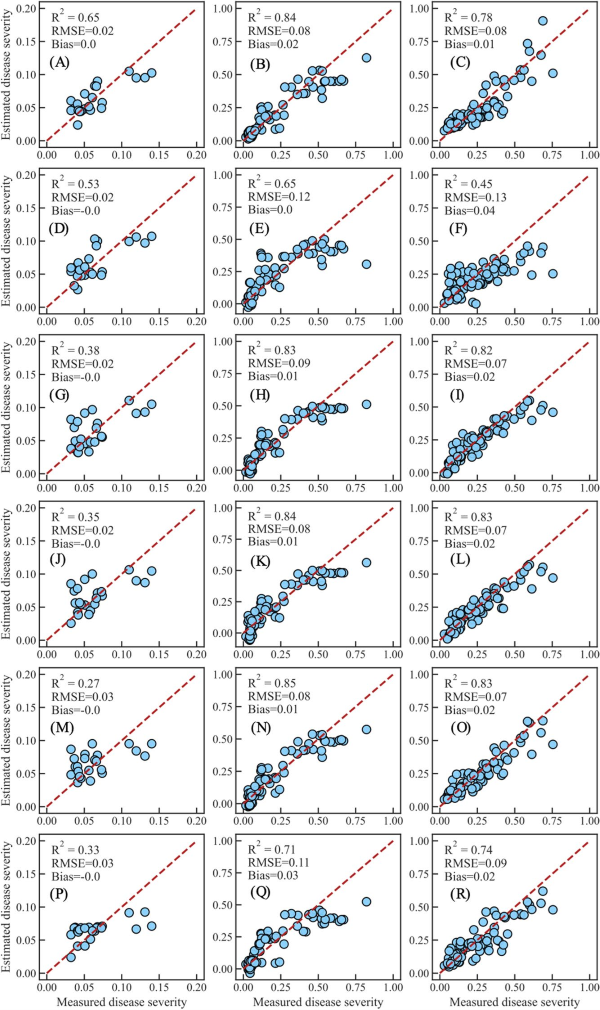 本研究确定了多个生长阶段对RSRD的光谱响应差异,并构建了一个新的指数RSRI,该指数对多个物候阶段的RSRD敏感。结果表明,灌浆阶段绿色和近红外区域的反射率对DS的敏感性显著低于开花阶段。RSRI的优化表明,蓝色波段的加入提高了抽穗阶段SI对DS的敏感性,增强了早期疾病检测能力。与NPCI、CCI、PRI670、PSRI和NDVI相比,RSRI在早期感染阶段对DS的敏感性最高,并且从抽穗到灌浆阶段在DS估计中表现最为稳定(抽穗:R² = 0.65,RMSE = 0.02;开花:R²= 0.84,RMSE = 0.08;灌浆:R²= 0.78,RMSE = 0.08)。此外,基于RSRI的模型比之前研究的SIs更能准确地映射轻微、轻度和严重感染样本的病斑分布。RSRI在早期感染阶段的DS估计和病斑映射可以为作物保护和病理学研究提供有效的参考。