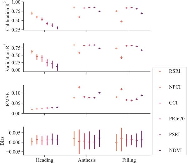 图9.在不同生长阶段(左列:抽穗,中列:开花,右列:灌浆)对RSRI和现有SIs在DS(疾病严重度)量化中的校准准确性(R²)、验证准确性(R²)、RMSE和偏差的比较。每一百轮评估的平均值(水平条)伴随着置信区间(垂直条)。
