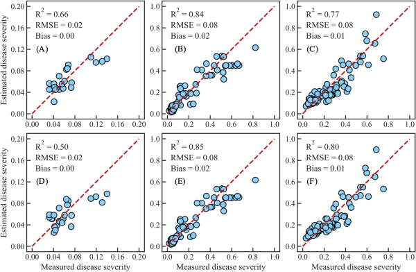 图13.使用基于RSRI的模型从多光谱数据(A-C Airphen相机,D-F RedEdge-MX相机)得出的测量和估算的量化DS散点图,分别对应抽穗(A, D)、开花(B, E)和灌浆(C, F)阶段。