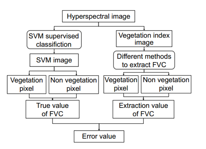 然后,分别采用像元二分法和DPK-means算法提取小麦的FVC,并基于支持向量机(SVM)监督分类结果对比分析了两种方法的提取效果,具体的提取过程如图3所示。最终,通过误差分析(EF、RMSE)、拟合度(R²)和误差分布图 对比不同方法的表现,以验证 DPK-means 在植被覆盖度提取中的适用性和优势。