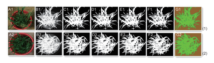 图4 .两种土壤条件下FVC提取效果:(1) 干土条件;(2) 湿土条件。A1和A2:可见光图像;B1和B2:NDVI灰度图像;C1和C2:通过干土阈值(T0)提取的灰度图像;D1和D2:通过DPK-means算法提取的灰度图像;E1和E2:通过湿土阈值(T1)提取的灰度图像;F1和F2:通过整体阈值(T2)提取的灰度图像;G1和G2:通过SVM算法提取的灰度图像。