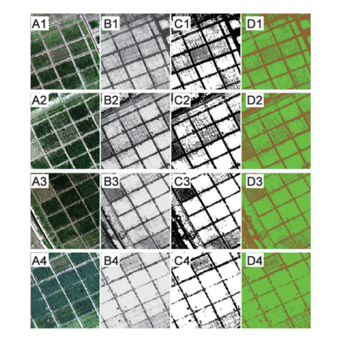 图6.无人机(UAV)高光谱图像在不同日期的提取结果:(1)、(2)、(3) 和 (4) 分别为无人机在D1(2019年3月8日)、D2(2019年3月16日)、D3(2019年3月25日)和D4(2019年4月11日)采集的样本图像。A. 可见光图像;B. NDVI灰度图像;C. 通过DPK-means算法提取的灰度图像;D. 通过SVM算法提取的灰度图像。