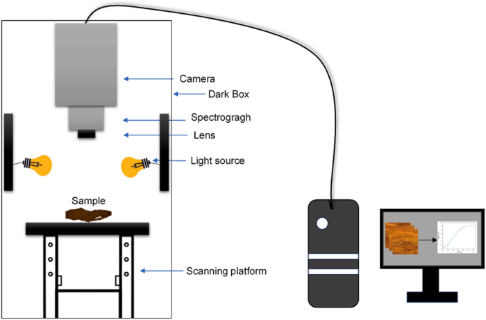 本研究采用的高光谱成像系统为内置推扫式相机(GaiaField Pro-V10E,江苏通宝TB888科技有限公司生产)。该系统的光谱检测范围为401-1046纳米,光谱分辨率达2.8纳米,像素分辨率为1392×1040,共包含360个波段。整套系统由高光谱相机(含四个100瓦溴钨灯光源)、载物台及计算机组成(如图1所示)。