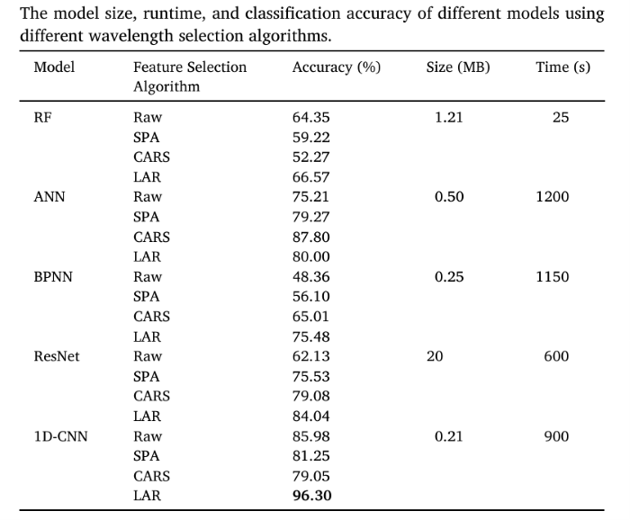 基于LAR算法选择的特征波段,结合MC预处理,进一步比较了1D-CNN与RF、ANN、BPNN和ResNet模型的分类结果(见下表),发现LAR-1D-CNN不仅在准确率上大幅*先(96.3%),且模型体积最小(0.21MB),运行效率更高。