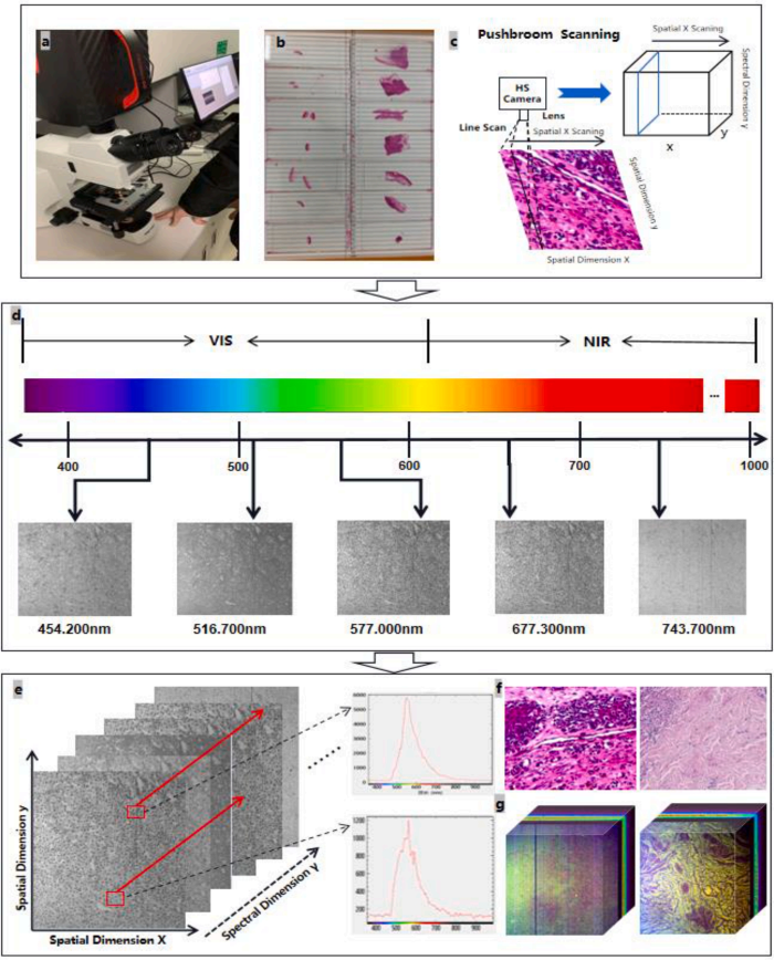 图1. (a) 用于获取高光谱图像的设备。(b) 一些黑色素瘤和色素痣样本。(c) 在高光谱相机上的扫描模式。(d) 从黑色素瘤(CMM)患者处获取的不同波长的高光谱图像。(e) 高光谱图像数据立方体。(f) 肿瘤组织样本(CMM)和色素痣样本的组织病理学图像。(g) 病理高光谱图像。