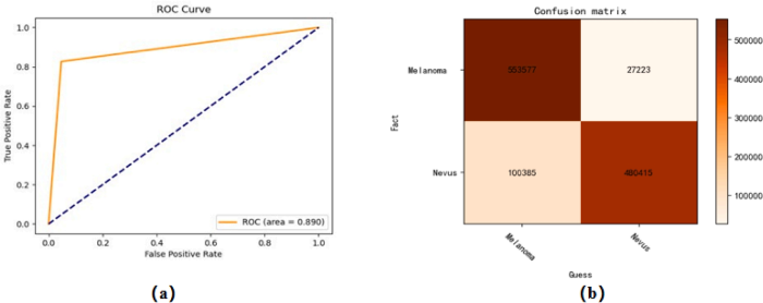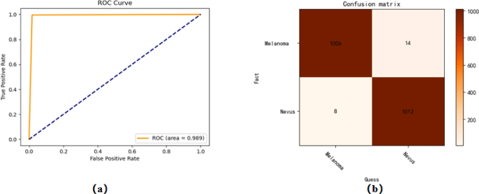 为了全*衡量所提出分类模型的性能,研究采用了准确率、ROC曲线、混淆矩阵来全*衡量所提分类模型的性能。准确率用于反映模型对整体样本的分类正确程度;ROC曲线通过绘制不同阈值下的真阳性率(TPR)与假阳性率(FPR)关系,评估模型的分类能力与鲁棒性;混淆矩阵则具体展示了模型对不同类别(黑色素瘤与色素痣)样本的识别情况,包括真正例、假正例、真负例和假负例的数量,从而进一步分析模型在哪些类别上存在误判或漏判现象。