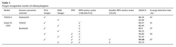 研究以高光谱图像立方体为基础,通过主成分分析(PCA)方法提取前三个主成分,将其构建为伪彩色图像,用于网络输入。然后,研究人员采用手工标注方式对孢子目标进行边界框标记,将数据集按9:1的比例分成训练集和测试集,训练过程中再按8:2的比例将训练集进一步分成训练集和测试集进行模型训练和验证。为了全*衡量目标检测效果,本文采用了Precision(*确率)、Recall(召回率)、平均查准率(AP)作为评价模型性能的指标。IOU度量预测框和目标框之间的重叠。网络模型通常会设置一个阈值,如果IOU超过阈值,则认为预测框是正确的。该研究将IOU阈值设置为0.5。