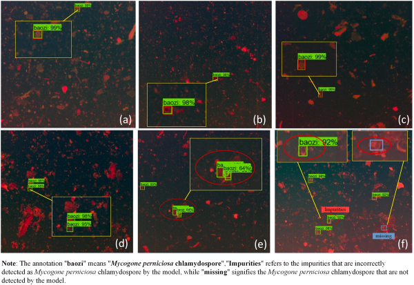 图3. 基于Resnet50-FPN改进的Faster R-CNN模型的识别结果:(a)-(d) 正确识别;(e) 展示了由于厚垣孢子重叠,检测模型产生了重复识别的情况;(f) 显示了厚垣孢子的误检和漏检情况。