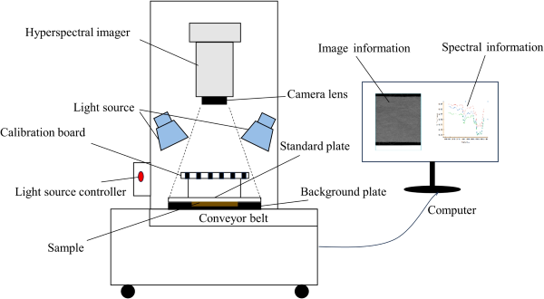 本研究中使用的高光谱成像系统是由江苏通宝TB888科技有限公司设计和开发的GaiaSorter-Dual全波段高光谱成像系统,如图1所示。该成像系统采用推扫式(push-broom)成像方式,光谱范围为920.8–2528.6纳米,光谱分辨率为5.7纳米,有效狭缝长度为9.6毫米,狭缝宽度为30微米,包含256个光谱通道,像素尺寸为30×30微米。图像采集速度设置为3厘米/秒,曝光时间为6毫秒,帧率为70赫兹。