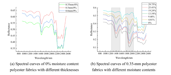 在本研究中,通过高光谱成像系统获取了150组不同规格和不同水分含量的聚酯织物的高光谱图像。在本节中,我们对三种不同厚度条件下不同水分含量的聚酯织物的光谱曲线进行了特征分析,并研究了这些光谱曲线之间的形态差异。这些聚酯织物的光谱曲线如图3所示。