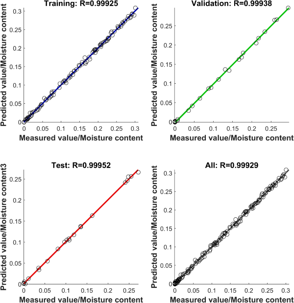 当模型同时使用1363 nm和1890 nm两个特征峰的面积和半高宽(FWHM)作为光谱特征变量时,训练集、验证集和测试集的MSE值均低于0.0015%,表明模型整体误差较小。测试集的相关系数(R值)达到0.99952,MSE为0.00090%(RMSE为0.2998%,即测试集中水分含量的预测误差约为0.2998 wt%)。MSE与R值综合表明,使用1363 nm和1890 nm特征峰的面积和FWHM作为光谱特征变量构建的模型具有***的性能。其相关性强(R值大于0.999),误差低(MSE小于0.0015%,RMSE小于0.3873%),显示该模型预测精度高。总体而言,在以1890 nm单一变量建模的基础上,进一步引入1363 nm特征峰的面积和FWHM可进一步提高相关性并降低误差。