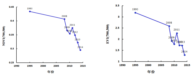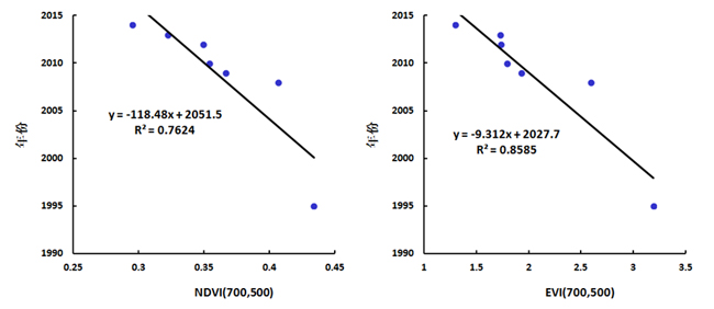 从PCA的彩色合成、NDVI图以及NDVI、EVI与年份之间的变化曲线可知,作图的2011年小麦种子,右图的2012年小麦种子,与整体的变化趋势不一样,故在分析NDVI、EVI与年份之间的关系时,删除异常年份数据。下面以左图7年的小麦种子为建模数据,右图4年的小麦种子为检验数据,根据建模数据的建模模型,验证模型的可靠性。如图9为NDVI、EVI与其相对应年份的的散点图及其趋势线,从图9可知,NDVI与其对应年份的决定系数为0.7624,EVI与其对应年份的决定系数为0.8585,从中可知,EVI与其相对应年份构建的模型的决定系数高于NDVI。