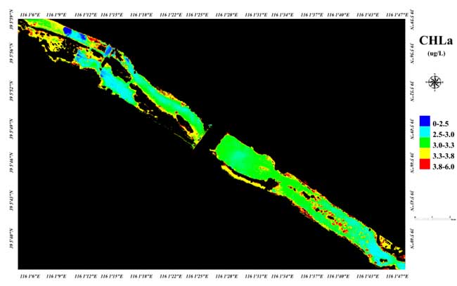 图2 雄安新区大清河高光谱三波段伪彩图和叶绿素a反演