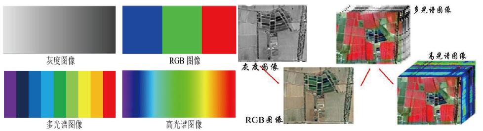 (左图)灰度图像、RGB图像、多光谱图像和高光谱图像波段数对比;