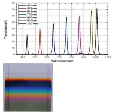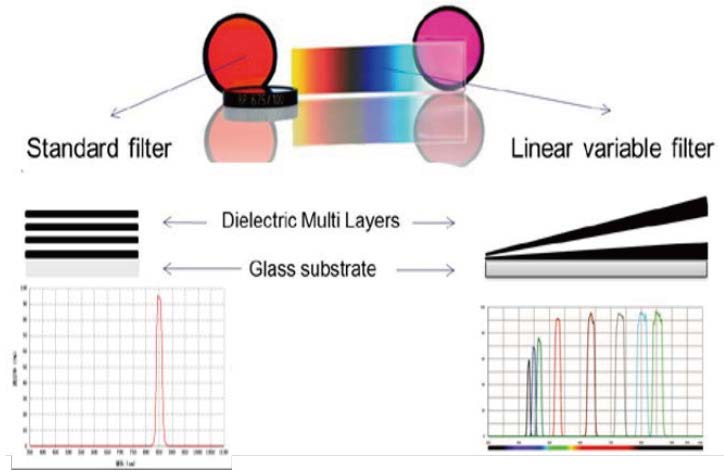 滤片式光谱相机利用特殊的镀膜技术,无需分光光谱仪模块,使得在光谱覆盖范围内的数十或数百条光谱波段对目标物体连续成像。在获得物体空间特征成像的同时,也获得了被测物体的光谱信息。渐变薄膜式高光谱相机是将不同波段的渐变薄膜镀制在面阵探测器上, 通过对目标成像,可同时、快速获取光谱和影像信息的无损检测分析仪器。
