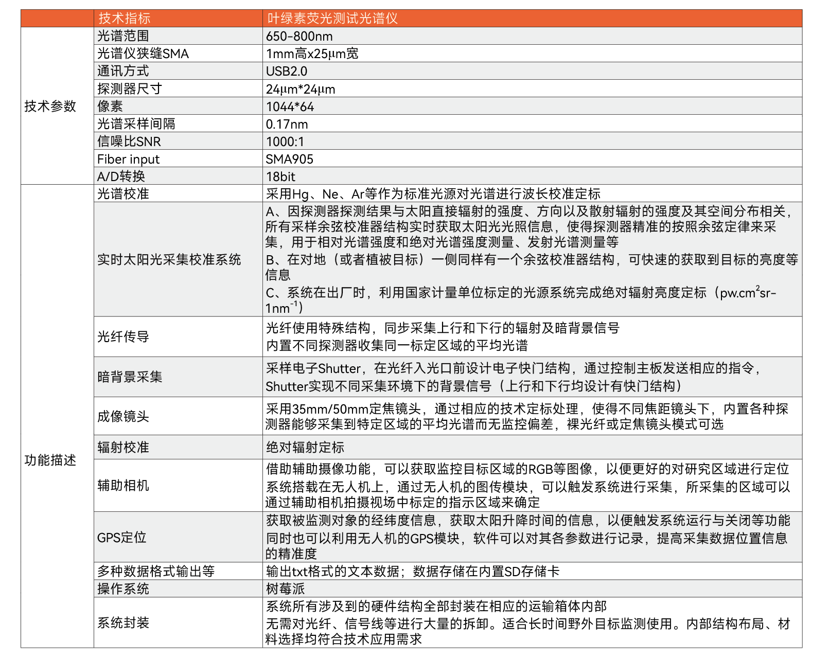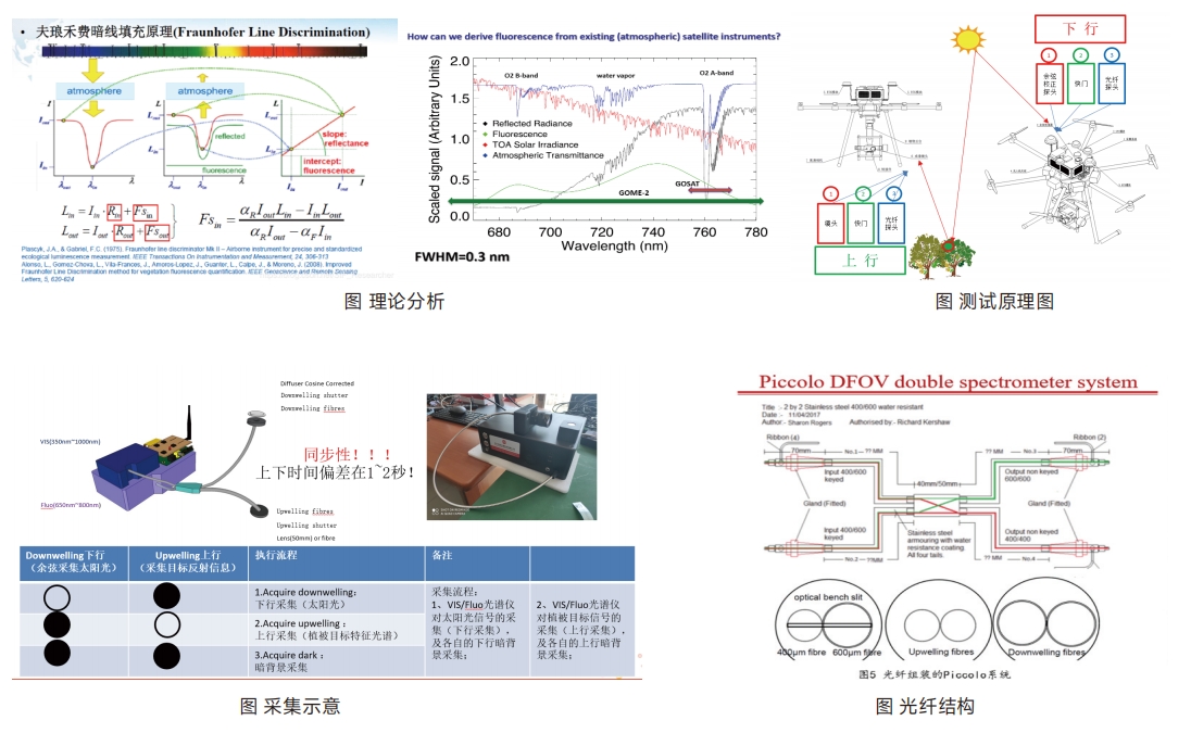 日光诱导叶绿素荧光监测系统与旋翼无人机的结合开辟了精准农业监测的新型应用。叶绿素荧光包含丰富的光合信息,通过提取能够表征植被、农作物、叶片、树木冠层等反射光谱信号中的荧光信息,再结合荧光参数、叶绿素等生理生化参数(地面瞬时环境条件下测定),可判断不同环境下(肥料、水分、病胁迫、病虫害等)作物的叶绿素荧光光谱特征及其荧光指标与其他参数(对冠层温度、表面的辐照度、叶绿素含量测量)之间的关系,因此机载叶绿素荧光监测技术是高效、适时、快速、灵敏、无损探测作物植被等生理状态及其与所处环境关系的理想监测技术,可广泛应用于评价植被等的健康状态。