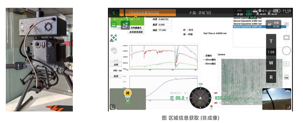 模块化集成,结构标准化,无需调试、调整系统结构,只需按照要求安装在无人机上即可,通过无线图传数据线实现系统与无人机、地面监控平台的互通。通过无人机云台给系统提供独立的供电。下行光纤与独立模块固定便于成像镜头的切换,辅助相机集成在独立模块上, 以便观察、监控采集区域。上行余弦校正功能实现模块化,实时采集太阳光照信号,其透过率高,匀化效果好,适应波段范围广。GPS 信息可以精准定位采集区域的位置信息。